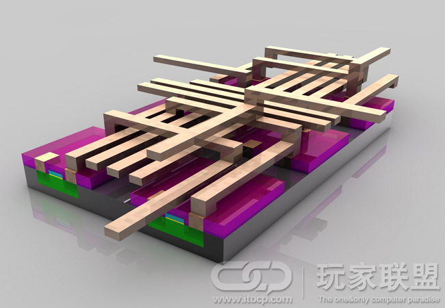 晶體管就緒:至此,晶體管已經(jīng)基本完成。在絕緣材(品紅色)上蝕刻出三個孔洞,并填充銅,以便和其它晶體管互連。