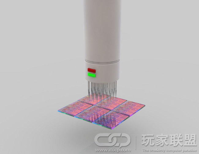晶圓測試:內(nèi)核級別,大約10毫米/0.5英寸。圖中是晶圓的局部,正在接受第一次功能性測試,使用參考電路圖案和每一塊芯片進行對比。